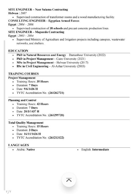 Seeking a job opportunity as a civil engineer with 22 years of experience in contracting, infrastructure construction, and water and sewage treatment plants. I hold a Master's degree in Project Management and am pursuing a PhD in Natural Resources and Energy, as well as a PhD in Major Project Management