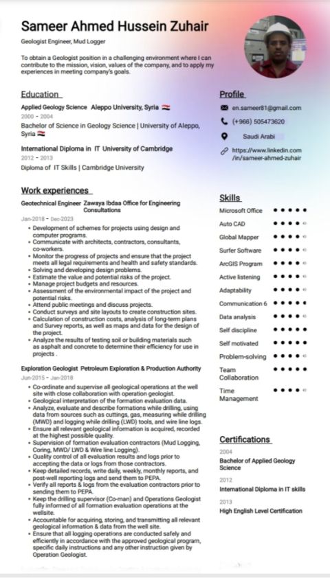 مهندس جيولوجي خبرة في مجال الدراسات الجيولوجية والاستكشافية، خبرة عمل مع شركات نفطية وتعدينية، خبرة عمل مع المكاتب الهندسية وشركات المقاولات ومختبرات التربة والخرسانة، عمل الجسات والتقارير الجيوتقنية. أجيد استخدام البرامج الهندسية Global Mapper, Surfer, AutoCAD. أجيد اللغة الانجليزية. مقيم بالمملكة العربية السعودية، وجاهز للانتقال للعمل