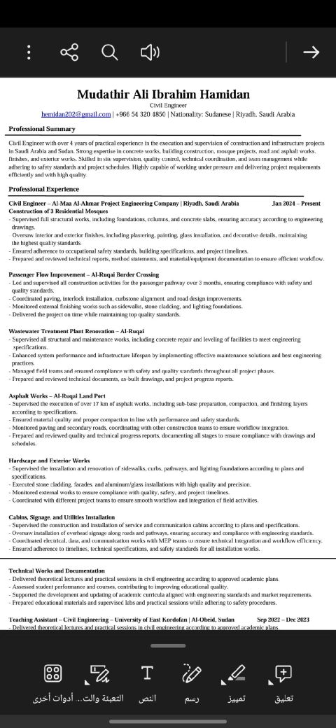 مهندس مدني - خبرة عملية تتجاوز أربع سنوات في مشاريع البنية التحتية، الطرق، والمباني - ابحث عن فرصة عمل مناسبة في السعودية امتلك خبرة واسعة في الاشراف الميداني على المشاريع وضبط جودة التنفيذ. اعداد التقارير الفنية والمراسلات. مراجعة واعتماد المواد والمخططات الفنية. المهارات الفنية اتقان AutoCAD وETABS وSAFE وProkon وROBOT. قدرة قوية على اعداد الوثائق الفنية والالتزام بالمعايير