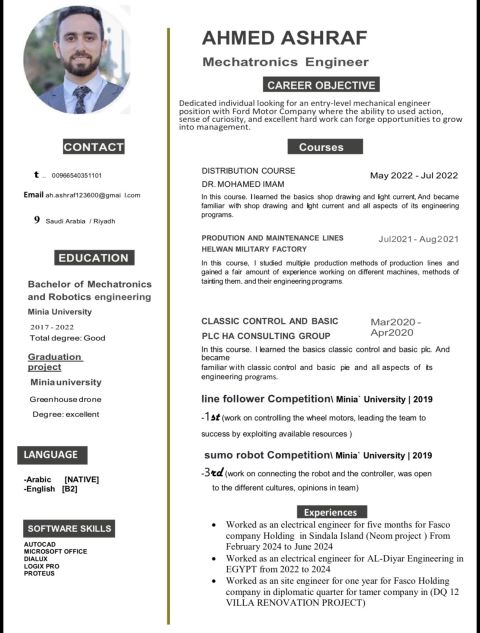 مهندس ميكاترونكس (اليكتروميكانيكال) خبرة بالصيانات الكهربائية والميكانيكية وأجراء الصيانات الوقائية وخبرة بمصانع تعبئة المواد الغذائية ومطاحن الدقيق ومصانع السيراميك وماكينات نفخ القوارير (PET) إقامة + رخصة هيئة المهندسين السعوديين + رخصة قيادة