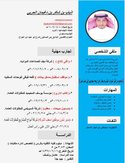 مدعوم من قبل الموارد البشرية أعادل عن 4 سعودين بنظام مكتب العمل مصنف من ذوي الاحتياجات الخاصة وأحمل شهادة دبلوم إدارة مكتبية لدي خبرة 16 سنة في الموارد البشرية والخدمات الحكوميه والمنصات مثل تم وبرنامج نقل ومقيم وقوي أستطيع العمل الميداني وعن بعد أو حسب الاتفاق