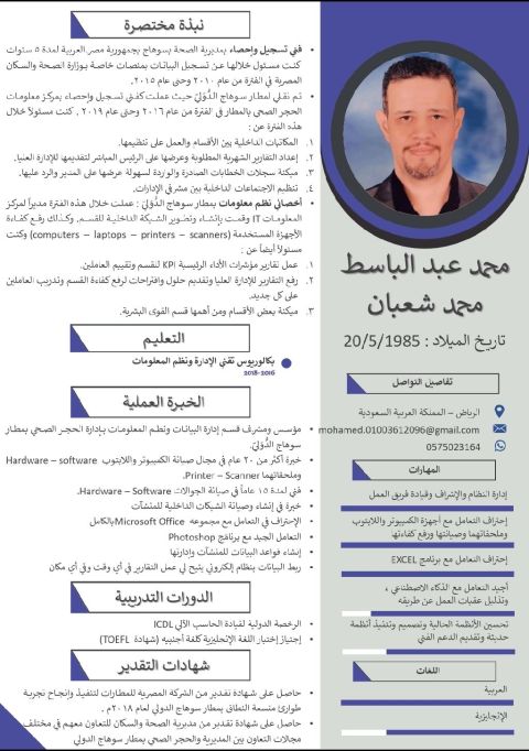 خريج ومتخصص في في قسم ألأيتي ولدي خبرة لمدة خمس في مجال القيمة المضافة (VAS) سنوات وعملت مشرف موظفين في القسم نفسه وأنا ابحث في المجال نفسه ومستعد للتطوير في المجال التقني