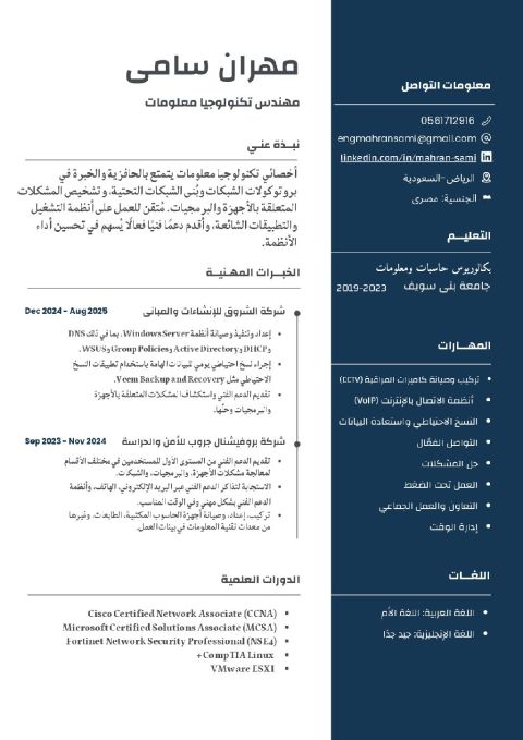 ابحث عن فرصة للعمل في شركة مجال دعم فني IT Help desk (تعريف طابعات - تحديث برامج تثبيت أنظمة التشغيل صيانة الاجهزة. الخ) وشبكات وCCTV - كايمرات مراقبة (تيار خفيف) في شركة IT أو شركة أو - مؤسسة مقيم في السعودية هذه سيرتي الذاتية لدي كورسات CCNA MCSA وخبرة عملية وعلاقات عملاء سابقة