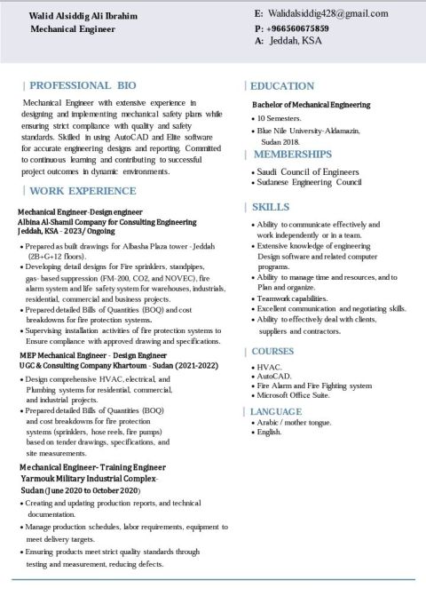 مهندس ميكانيكا تصميم سوداني الجنسية لدي خبرة 3 سنوات في أنظمة السلامة في مجال الاستشارات الهندسيه في السعودية، الخبرة تتضمن تصميم مخططات السلامة وتشمل الاطفاء والانذار والسلامة المعماريه وفقا للكود السعودي واعداد التقارير الفنيه والوثائق الخاصه بالتصميم من حصر الكميات والمواصفات، الرفع من الطبيعة لأنظمة السلامة التعامل مع الدفاع المدني والعملاء اجادة الاوتوكاد وبرامج المايكروسوفت ابحث عن فرصة عمل