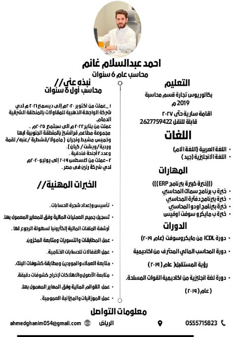 محاسب أول 6 سنوات تأسيس الحسابات واعداد التقارير المالية الموازنات اعداد ملف الميزانية رفع تقارير القيمة المضافة العمل على كثير من البرامج المحاسبة ERP أسماك كويك بوكس أودو دفتره. اعداد إقفالات الفترة التسويات متابعة المخزون العملاء الموردين إقامة سارية سنة. رخصة قيادة