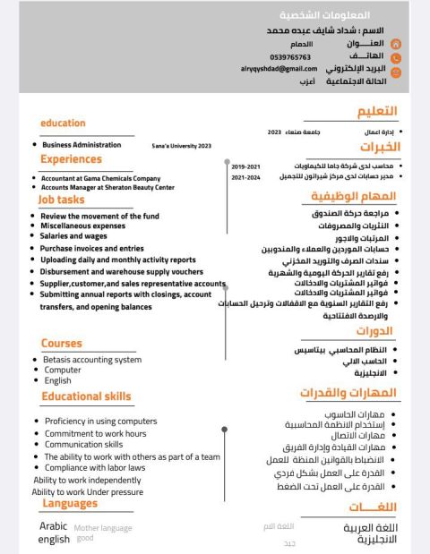 بكالوريوس ادارة أعمال خبرة واسعه في إدارة الحسابات من القيود اليومية حتى القوائم المالية والعمل على متابعة ومطابقة حسابات العملاء والمندوبين والموردين والبنوك واعداد كشوفات الرواتب ورفع التقارير وغيرها من العمليات المحاسبية جاهز لنقل الكفالة الإقامة سارية