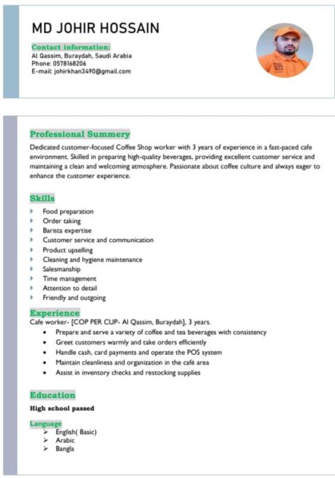 Professional Summery Dedicated customer - focused Coffee Shop worker with 3 years of experience in a fast - paced cafe environment. Skilled in preparing high - quality beverages, providing excellent customer service and maintaining a clean and welcoming atmosphere. Passionate about coffee culture and always eager to enhance the customer experience. Skills Food preparation Order taking Barista exper