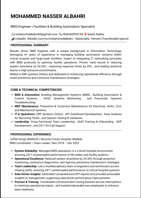 BMS Engineer with over 4 years of experience in building management systems, facility operations, and maintenance within critical environments such as hospitals. Skilled in system monitoring, fault troubleshooting, team leadership, and KPI reporting. Currently seeking a suitable opportunity in BMS, facilities management, or technical operations where I can contribute to improving system performance