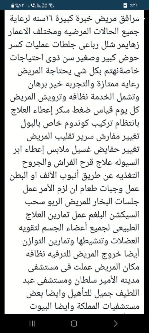مرافق مريض خبرة 17 سنة لرعاية كبار وصغار السنوجميع الحالات المرضيه زهايمر شلل رباعي جلطات عمليات كسر حوض ذوي احتياجات خاصه وترويش ونظافة المريض قياس ضغط سكر وابر سيوله عمل جلسات العلاج الطبيعي لجميع المرضى وتركيب كندم خاص بالبول والتغذية عن طريق أنبوب الأنف أو البطن وعمل وجبات طعام ونظافة مكان المريض وغسيل الملابس وتقليب المريض كل ساعتين وعمل جلسات البخار لمريض الربو. أبو سالي
