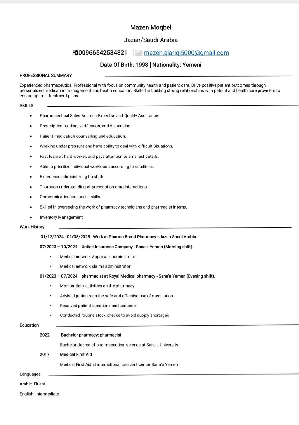 الاسم مازن عبدالوهاب عبدالغني مقبل. العمر 26 الحالة الاجتماعيه عازب الجنسية يمني بكالوريوس صيدلة جامعة صنعاء. حاصل على ترخيص من الهيئة السعودية للتخصصات الصحية. ذو أمانة وأخلاق واخلاص في العمل وحسن السيرة والسلوك جاهز لنقل الكفالة