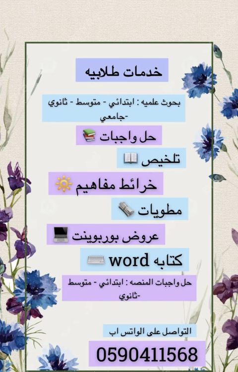 خدمات طلابيه جميع المراحل الدراسية معلمه خصوصيه للمبتدئين