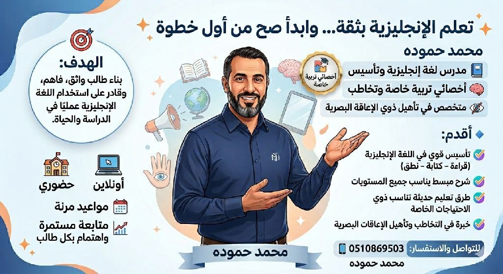 تبحث عن أخصائي تربية خاصة محترف أو تأسيس قوي في اللغة الانجليزية ابدأ صح من أول خطوة مع الأستاذ / محمد حموده