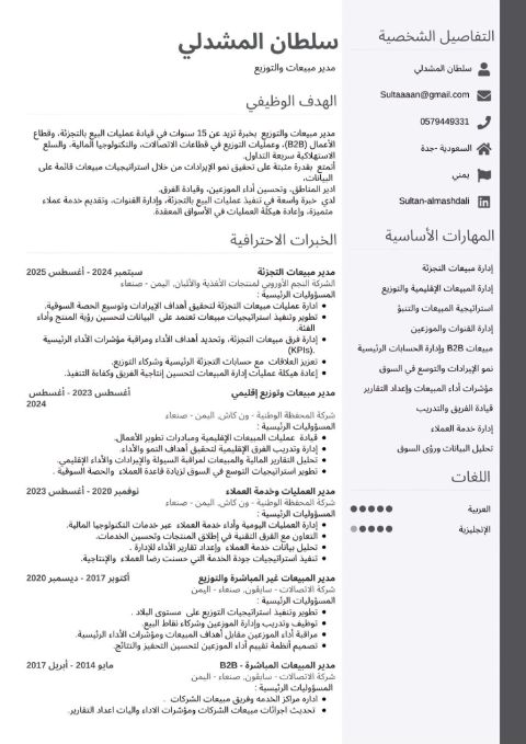 رجل مبيعات بخبرة واسعه في إدارة المبيعات المباشرة (مبيعات الشركات والتجزئة) والتوزيع وادارة الفروع، متمكن في التخطيط وتحليل البيانات وبناء علاقات مع العملاء مع قدرة قوية على تدريب وقيادة الفرق. الميدانيه وتحقيق الأهداف