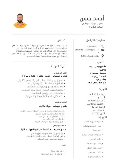 مندوب مبيعات نشيط وله خبرة تزيد عن 5 سنوات في مجال التجزئة والمبيعات، متخصص في تقديم أفضل الخدمات للعملاء وتحقيق الأهداف البيعية. ماهر في بناء العلاقات وتحديد احتياجات العملاء والعمل تحت ضغط مع فرق متنوعة. يمتلك خبرة جيدة في استخدام تطبيقات أوفيس، ولديه رخصة قيادة سارية ومستعد للتنقل حسب متطلبات العمل