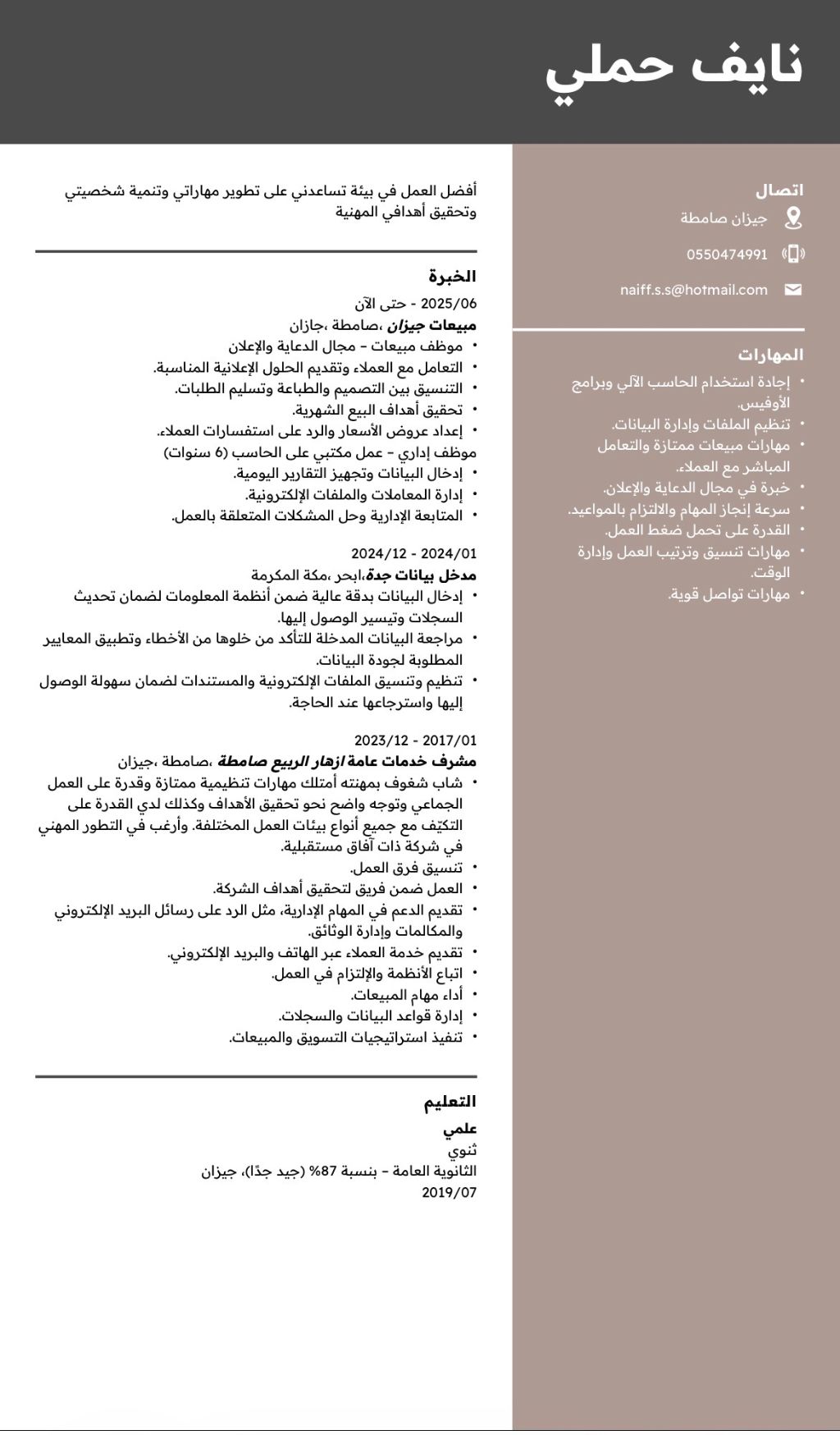 موظف اداري ومبيعات بخبرة 6 سنوات في العمل على اجهزة الكمبيوتر وإدارة المهام الفنية والادارية. أتميز بدقة في التعامل مع الملفات والبيانات، وقدرة عالية على التواصل وخدمة العملاء، اضافة الى خبرة قوية في مجال الدعاية والاعلان والتسويق والمبيعات. اعمل بروح الفريق وأسعى دائما لتطوير مهاراتي وتحقيق أفضل النتائج