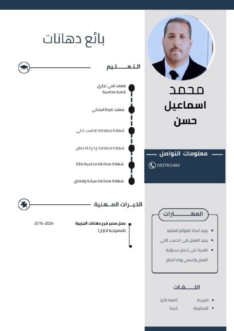 الاسم بدر مقبل سيف العمر 22 سنة الجنسية يمني الحالة الاجتماعية أعزب المؤهل العلمي ثانوية عامة - الرخصة الدولية لقيادة الحاسوب رخصة القيادة متوفره الخبرات العملية - عملت مع شركة نفوذ القابضة للمواد الغذائية (مأمولا) لمدة 6 أشهر كاشير، ثم تمت ترقيتي الى مشرف فرع لمدة 7 أشهر. عملت مع مؤسسة فن السكر (معمول هشه) لمدة سنة و8 أشهر كمشرف فرع. عملت لدى مؤسسة أتريتاء شوكولا لمدة 7 أشهر كمشرف فرع