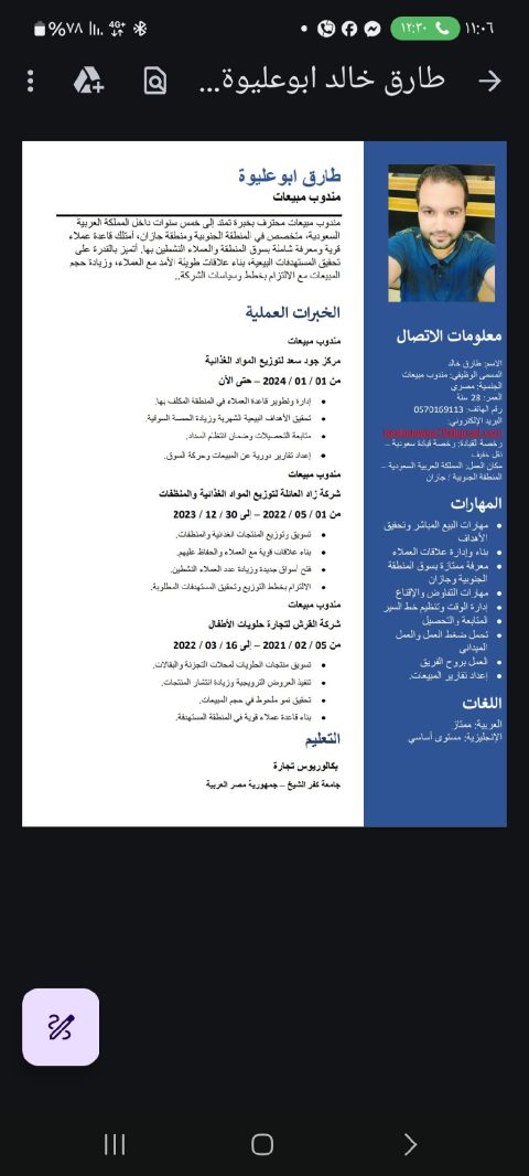 مندوب مبيعات مصري الجنسية خبرة 5 سنوات في مجال الكاش فان في المنطقة الجنوبية في جازان ولدي قاعدة عملاء كبيرة وعلي دراية واسعه بالمنطقة وعملائها ولدي خبرة كبيرة في توزيع المواد الغذائية والتعامل مع العملاء وفتح سوق والترويج والتوزيع للمنتجات وبناء قاعدة عملاء كبيرة