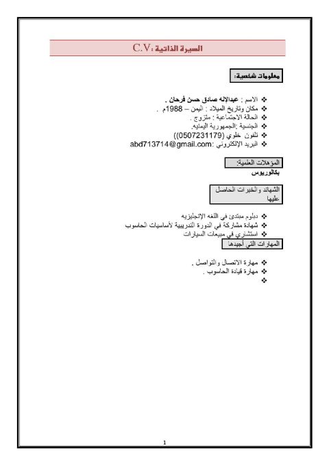 الاسم علي محمد الجمال العمر 30 عاما لدي خبرة في مجال المبيعات حيث عملت مندوب مبيعات في شركة الوفاق للمواد الغذائية، كما عملت في شركة الماجد للعود ابحث عن فرصة عمل مناسبة في مجال المبيعات أو خدمة العملاء، وأسعى لتطوير مهاراتي وتحقيق أهداف الشركة