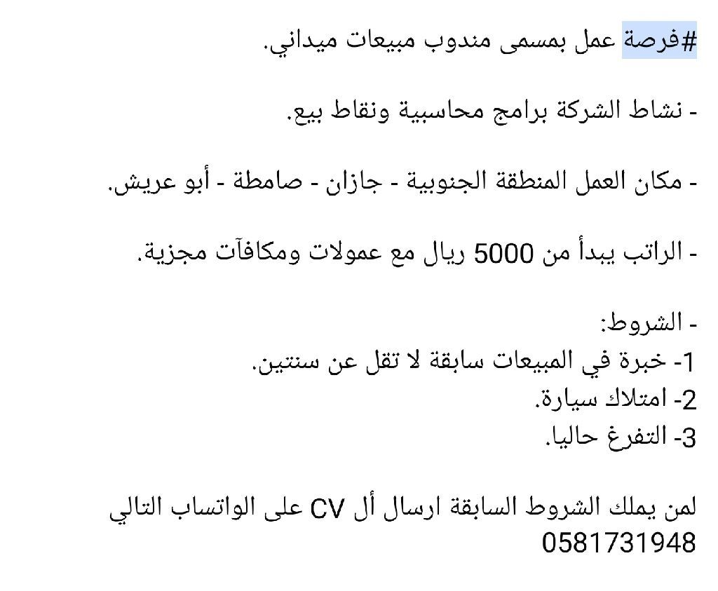 فرصة عمل مندوب مبيعات ميداني) نشاط الشركة برامج محاسبية ونقاط بيع) مكان العمل المنطقة الجنوبية (جازان - صامطة - أبو عريش) الراتب يبدأ من 5000 ريال مع عمولات ومكافآت مجزية) الشروط 1 - خبرة في المبيعات سابقة لا تقل عن سنتين. 2 - امتلاك سيارة. 3 - التفرغ حاليا. لمن يملك الشروط السابقة إرسال السيرة الذاتية على الواتساب التالي