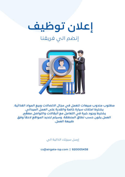 مطلوب مندوب مبيعات للعمل في مجال الاتصالات ونقاط البيع شرائح الكترونية وبيع المواد الغذائية. يشترط امتلاك سيارة خاصة والقدرة على العمل الميداني. يشترط وجود خبرة في التعامل مع البقالات والتواصل معهم. العمل يكون حسب نطاق المنطقة، وسيتم تحديد المواقع لاحقا وفق طبيعة العمل. جميع مناطق المملكة الراتب يحدد بعد المقابلة الشخصية. إرسال السيرة الذاتية على الايميل المرفق / وعلى الرقم الموجود في الصورة