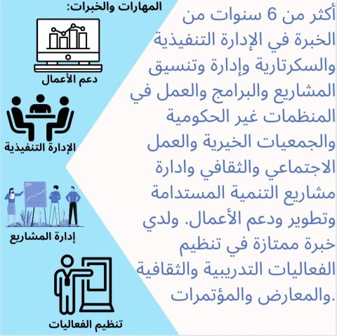 ابحث عن عمل في مدينة الرياض وما حولها، لدي خبرة أكثر من 6 سنوات كمساعد اداري وسكرتير تنفيذي وفي تنسيق المشاريع وادارة البرامج. مع خبرة ممتازة في تنظيم الفعاليات بمختلف أنواعها والمهرجانات والمعارض والمؤتمرات، وادارة المحتوى على المنصات الرقمية ومجيد للغة الانجليزية