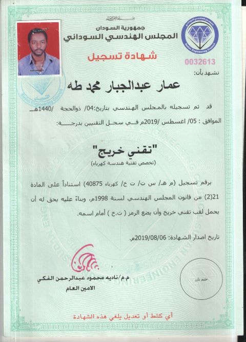 مشرف وفني فحص محطات كهرباء أرضي وميني بيلر ومحطات وفيادر هوائي وعدادات معالجة اتصال وباور أوف واستبدال (IFS - Fmms) مؤهل عالي