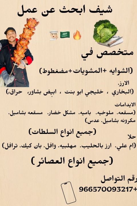شيف شواية وبخاري ورز حراق ورز أبو بنت ورز أبيض بشاور ومشويات وشواية حراق وحلويات وايدامات وبشامل وعصائر وسلطات قادر على عمل منيو كامل وتدريب أستطاف وملم بسستم فودكس بالكامل والعمل علي تقليل التكلفة مع ثبات التست