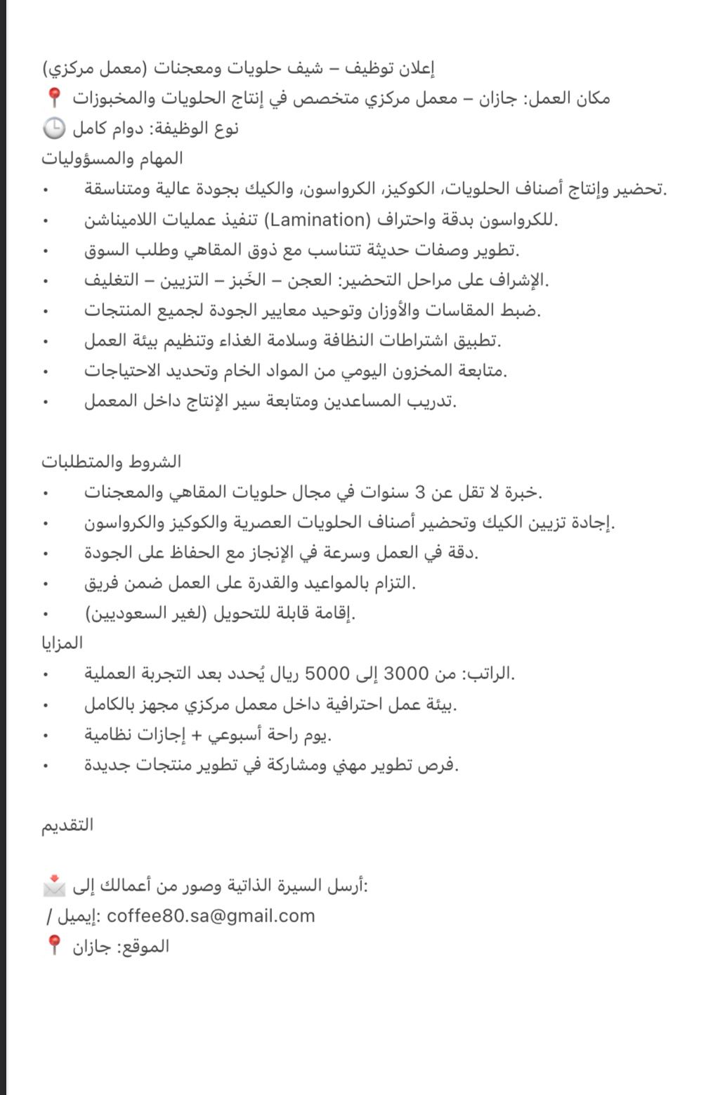 مطلوب شيف حلويات نبحث عن شيف محترف في الكروسان، الكوكيز، والكيكات للانضمام لفريقنا - يشترط خبرة سابقة في مجال الكوفي والمخبوزات دوام كامل - بيئة عمل احترافي العمل في جازان - حي الصفا