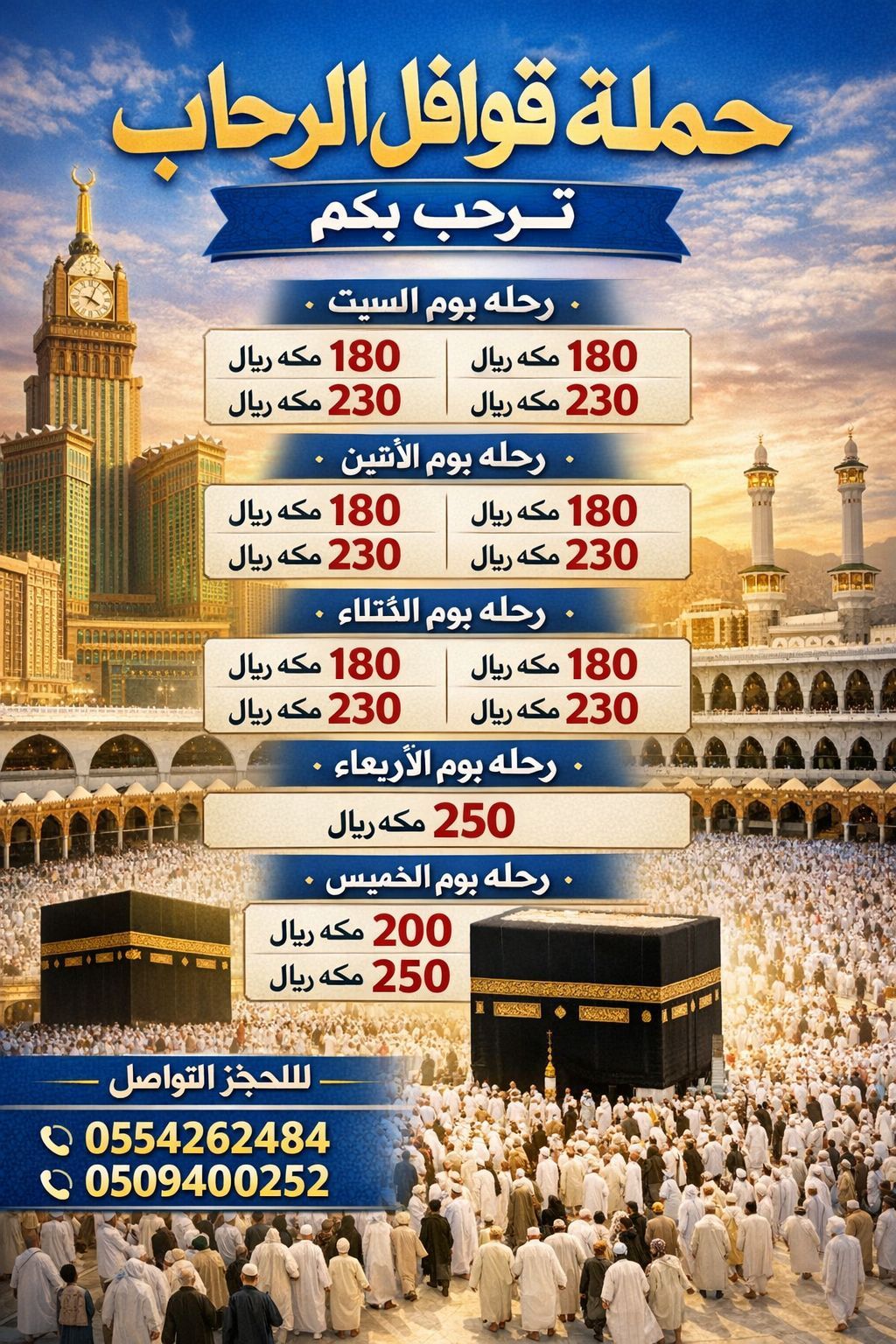 حملة قوافل الرحاب ترحب بكم رحلة يوم السبت 3 أيام مكة 180 ريال 4 أيام مكة 230 ريال رحلة يوم الأحد 3 أيام مكة 180 ريال 4 أيام مكة 230 ريال رحلة يوم الاثنين 3 أيام مكة 180 ريال 4 أيام مكة 230 ريال رحلة يوم الثلاثاء 3 أيام مكة 180 ريال 4 أيام مكة 230 ريال رحلة يوم الأربعاء 3 أيام مكة 180 ريال 4 أيام مكة 250 ريال رحلة يوم الخميس 3 أيام مكة 180 ريال 4 أيام مكة 250
