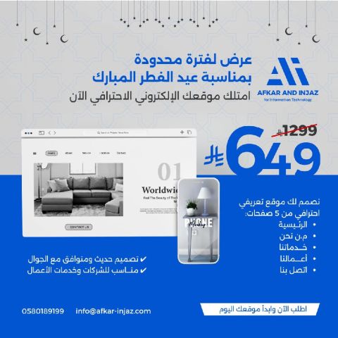 بمناسبة عيد الفطر خصم 50 على تصميم المواقع الالكترونية اذا عندك شركة أو نشاط وتحتاج موقع، نصمم لك موقع تعريفي بسيط ومرتب من 5 صفحات الرئيسية - من نحن - الخدمات - أعمالنا - تواصل معنا. الموقع يكون متوافق مع الجوال والكمبيوتر. السعر قبل 1299 ريال الآن 649 ريال فقط شامل كل شيء