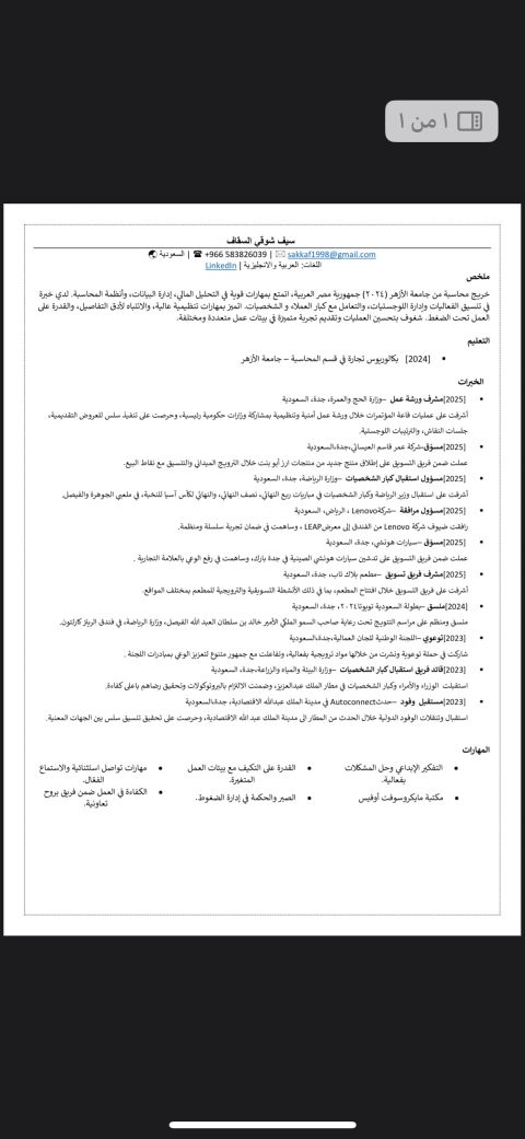 باحث عن عمل - المملكة العربية السعودية محترف ذو خبرة 15 عاما في المملكة العربية السعودية ودبي، يبحث عن فرصة عمل مناسبة. الخبرة في الخدمات اللوجستية والعمليات - المحاسبة (الحسابات الدائنة، الحسابات المدينة، ضريبة القيمة المضافة، الرواتب) إدارة المكاتب - دعم المبيعات عملت سابقا في شركات تجارية ولوجستية وتجزئة. مستعد للعمل في أي مجال. رخصة قيادة سعودية سارية المفعول - اقامة قابلة للتحويل (مقيم