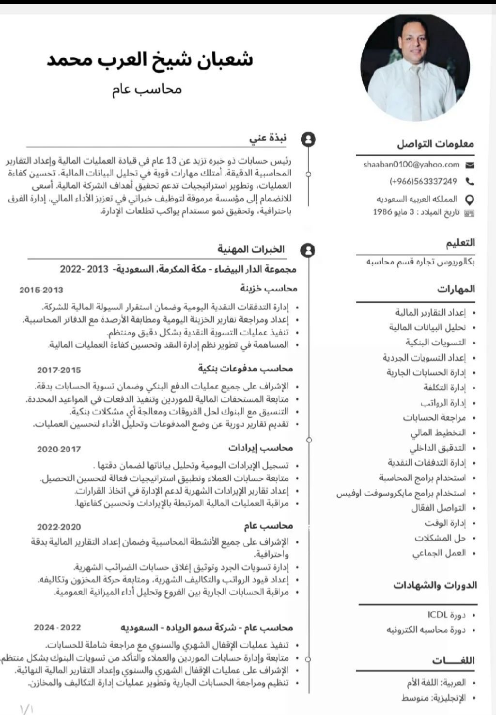 محاسب متواجد بمدينة جدة خبرة بالحسابات 12 عام بالمملكة. خبرة بالمدفوعات البنكية ومتابعه حسابات الموردين وتسويات البنوك الشهريه ومتابعه حسابات العملاء. الأقفال الشهري والسنوي وعمل التسويات الجردية. أقفال حسابات الضريبة الشهريه وأقفال قيود الرواتب الشهريه وقيود التكاليف والمخازن ومتابعه الحسابات الجاريه بين الفروع وحسابات الملاك تحليل حسابات الميزانية اعداد الدليل المحاسبي للشركة
