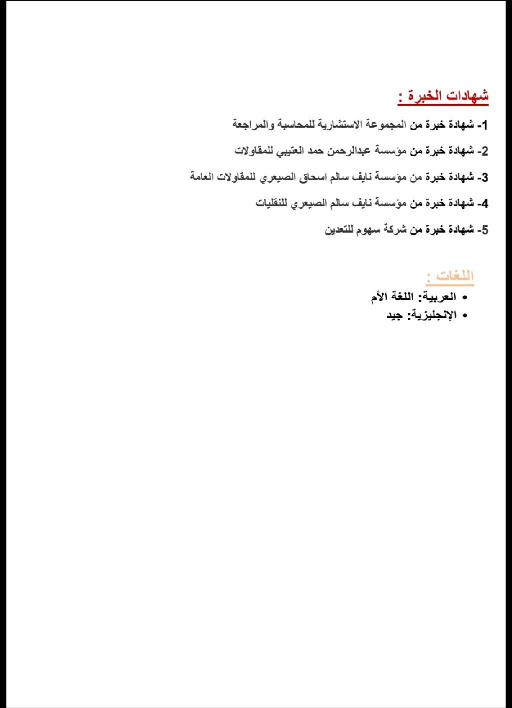 محاسب ومصمم نظام محاسبي مستندي ودفتري واستخدام الكمبيوتر واعداد الحسابات الختامية والقوائم المالية وتجهيز المستندات والدفاتر للفحص الضريبي والتوجيه الفني المحاسبي للمستندات وتسجيل العمليات المالية بالدفاتر المحاسبية. 2 - محاسب عام لدي مؤسسة بندر المطيري للمقاوالت القصيم