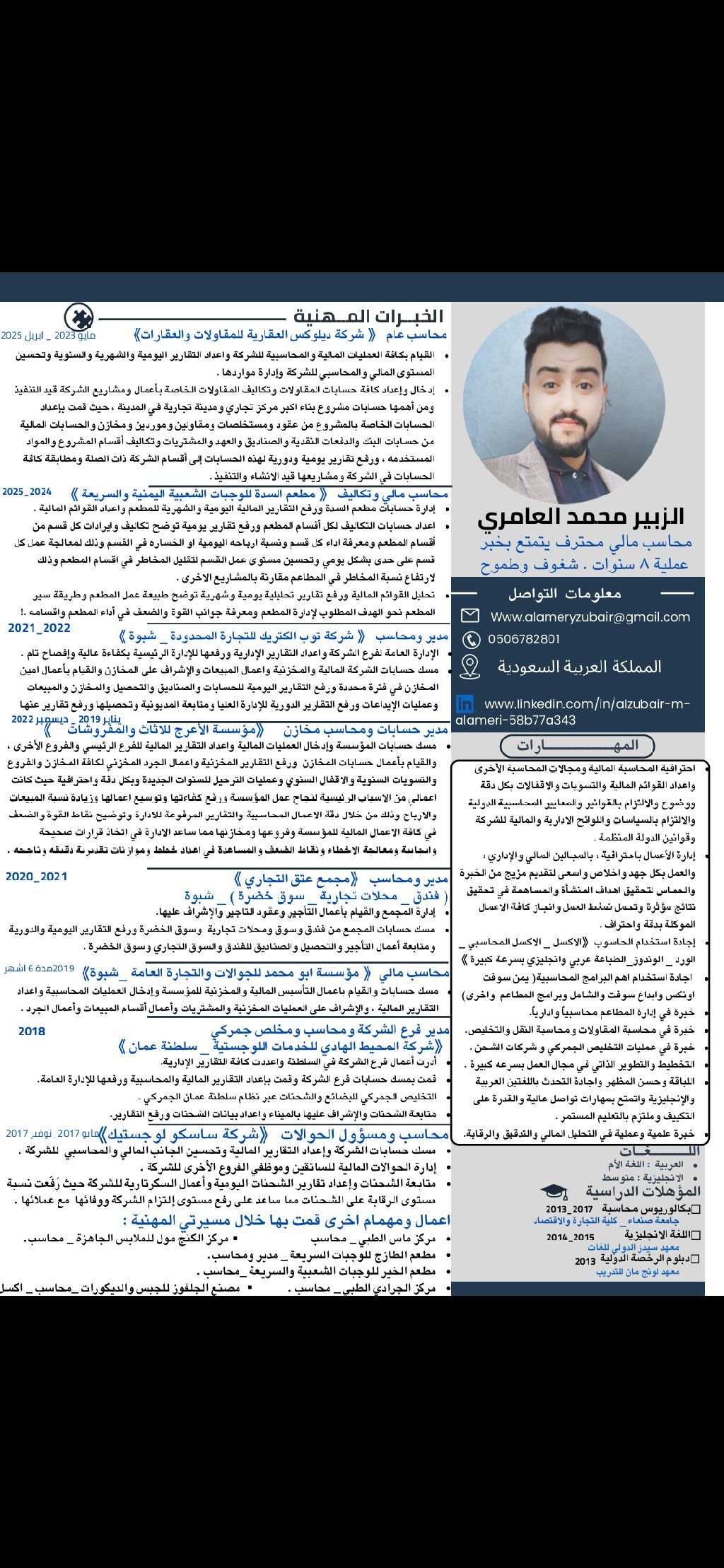 محاسب يمني بكالوريوس. خبرة 8 سنوات في مجالات المحاسبة المالية ومحاسبة المقاولات ومحاسبة التكاليف ومحاسبة المطاعم والمخازن ومحاسبة النقل والشحن والتخليص الجمركي وعمليات الشحن والتخليص الجمركي والمجالات الأخرى مع اعداد القوائم المالية والتسويات والأقفالات والتحليل المالي. القدرة على استخدام البرامج المحاسبية المتطورة ERP وبرامج الكمبيوتر وبالأخص الاكسل والاكسل المحاسبي. مع اجادة متوسطة للغة الانجليزية