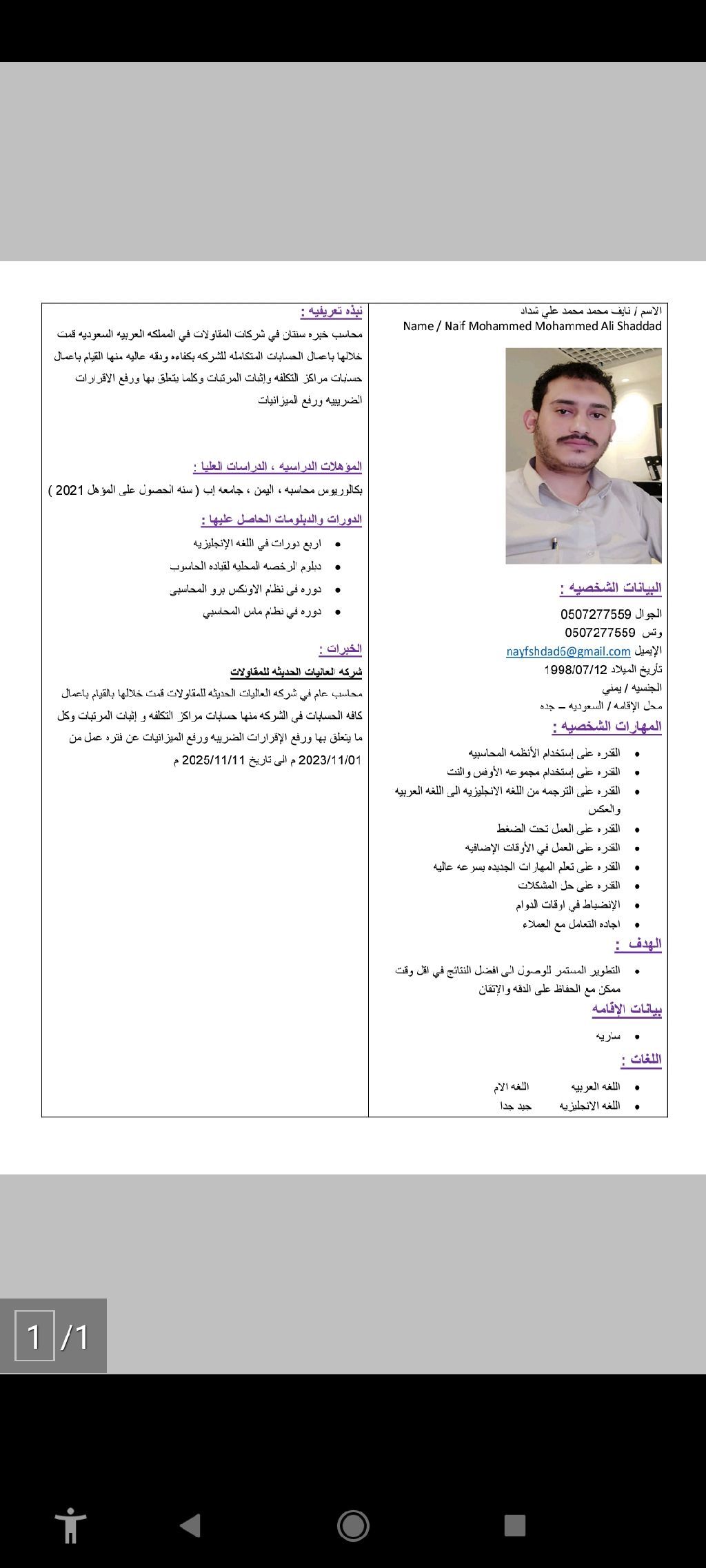 أنا نايف محمد محاسب خبرة سنتان في شركات المقاولات في المملكة العربية السعودية - جدة لدي الخبرة الكافيه في حسابات شركات المقاولات ابحث عن فرصة عمل
