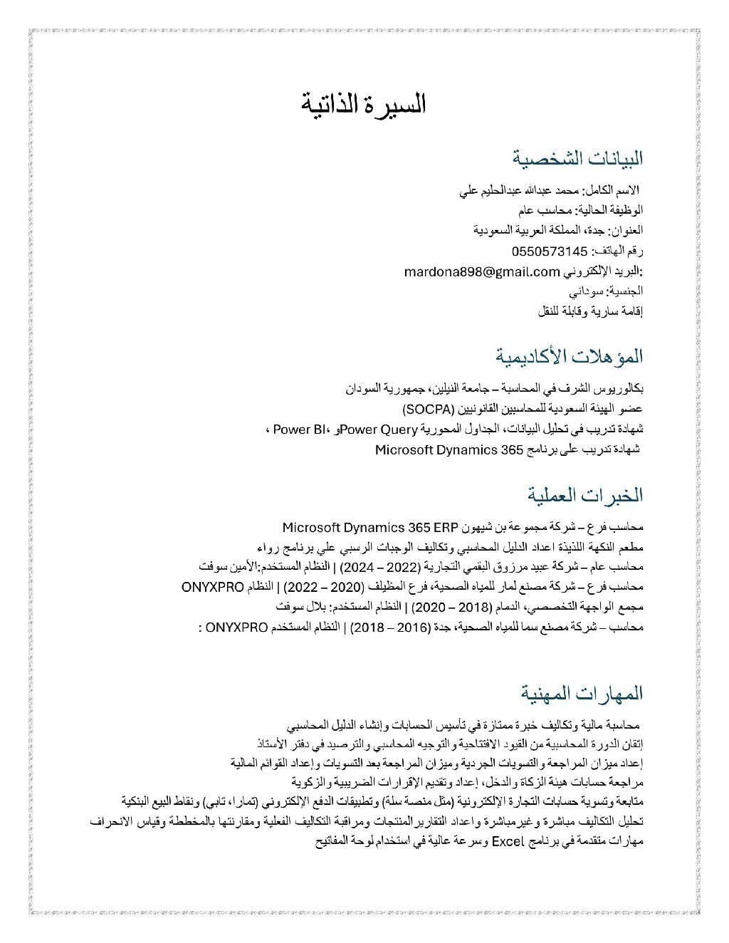 محاسب خبرة داخل السعودية وحاصل علي شهادة عضوية الهيئة السعودية للمحاسبين وإقامة سارية وجاهز للنقل خبرة في المالية والتكاليف عملت في شركة مجموعة بن شيءهون ومحاسب فرع في مصنع كربونات الكالسيوم محاسب فرع شركة مياه لمار ومحاسب فرع جدة مصنع سما للمياه مهام ادارة العملاء والموردين وادارة مخازن الاشراف ع الحسابات وعمل قيود تسوية البنوك ونقاط البيع والضريبة والزكاة وتمارا وتابي واعداد القوائم المالية وجاهز