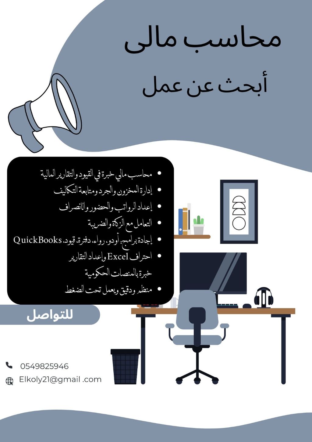 محاسب مالي خبرة في القيود اليومية، التقارير المالية، المخزون، الرواتب، والتعامل مع الزكاة والضريبة. اجادة العمل على برامج أودو Odoo، رواء، دفترة، قيود، Quickbooks وExcel، مع خبرة في المنصات الحكومية. منظم، دقيق، وقادر على العمل تحت الضغط