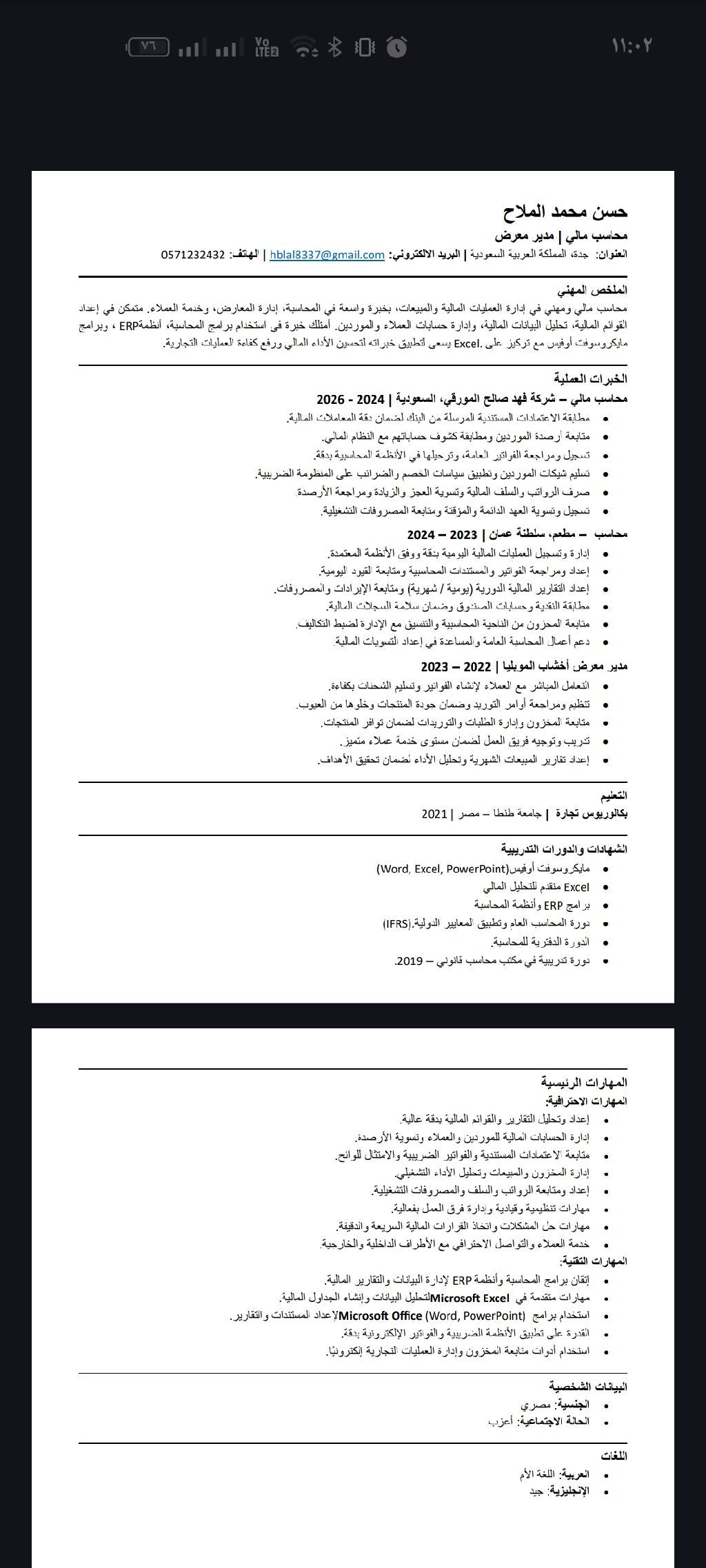 محاسب السيرة الذاتية الاسم حسن محمد الملاح تاريخ الميلاد 5 / 5/ 1999 رقم الهاتف 0571232432 - الملخص المهني خريج بكالوريوس تجارة، خبرة سنتين (2023 - 2025) في مجال المبيعات والمحاسبة، مع تركيز على العمل ك مندوب مبيعات. يتميز بالقدرة على بناء علاقات قوية مع العملاء، تحقيق الأهداف البيعية، وإدارة العمليات المالية المرتبطة بالمبيعات. التعليم - بكالوريوس تجارة - 2021