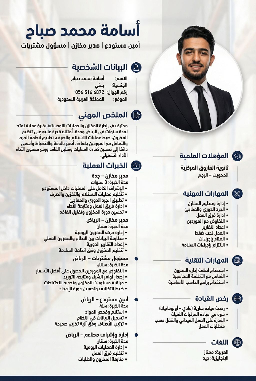 محترف في إدارة المشتريات والمستودعات والعمليات اللوجستية أتمتع بخبرة عملية لعدة سنوات في الرياض وجدة، امتلك مهارات قوية في إدارة المخزون، بما في ذلك إدارة عمليات الاستلام والتسليم، وتنفيذ أنظمة مراقبة المخزون، والتعامل بكفاءة مع الموردين، أتميز بالدقة والانضباط والقدرة على العمل تحت الضغط، أسعى باستمرار لتحسين الكفاءة التشغيلية وتقليل الهدر وتعزيز الأداء التشغيلي العام