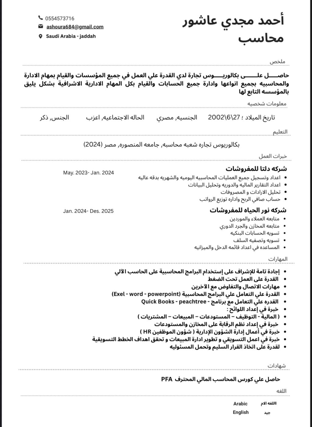 محاسب مقيم في جدة إقامة محاسب سارية ابحث عن دوام كلي جاهز للعمل والنقل فورا