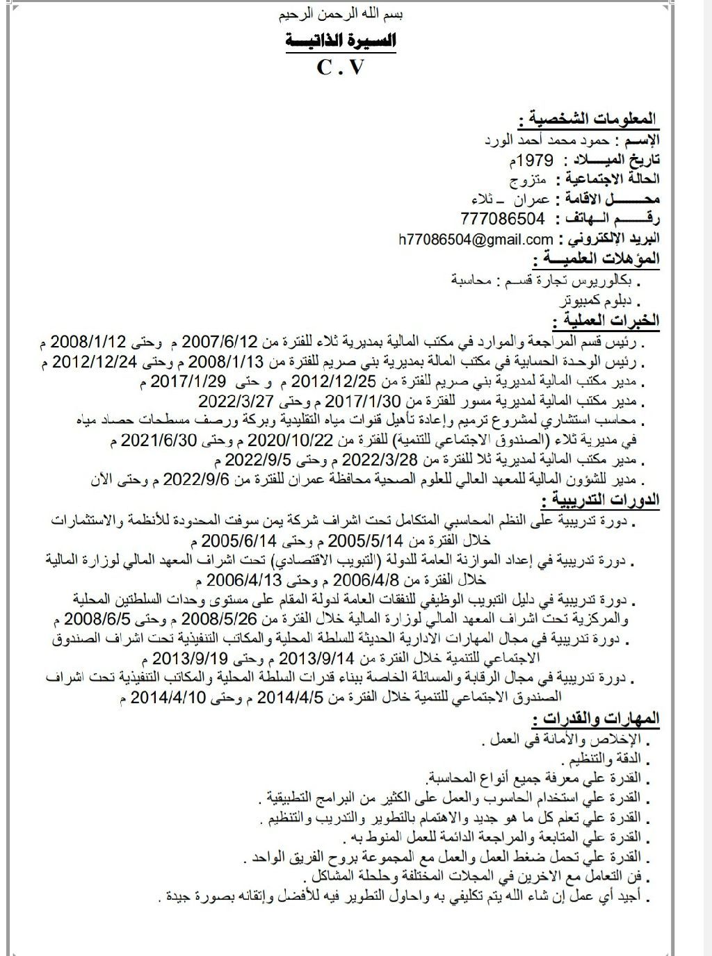 محاسب بكالوريوس تجارة. دبلوم كمبيوتر. رئيس قسم المراجعة والموارد في مكتب المالية بمديرية ثلاء للفترة من 2007 / 6/ 12م وحتى 2008 / 1/ 12م. رئيس الوحدة الحسابية في مكتب المالة بمديرية بني صريم للفترة من 2008 / 1/ 13م وحتى 2012 / 12/ 24م. مدير مكتب المالية لمديرية بني صريم للفترة من 2012 / 12/ 25م وحتى 2017 / 1/ 29م. مدير مكتب المالية لمديرية مسور للفترة من 2017 / 1/ 30م وحتى 2022 / 3/ 27. محاسب استشاري