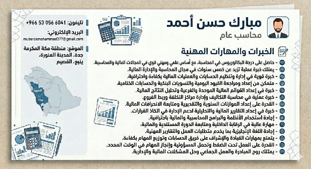 محاسب سوداني بخبرة تفوق 5 سنوات، ابحث عن فرصة عمل بدوام كامل في منطقة مكة والمدينة والقصيم، إقامة سارية ورخصة قيادة. اعداد وتحليل القوائم المالية، التقارير الضريبية، إدارة الحسابات، الرواتب، الموردين العملاء، المشتريات داخلية وخارجية، المبيعات، نقاط البيع، مبيعات الاونلاين، مطابقة البنوك. مع اتقان لأنظمة ERP، Excel أونكس، أودو، أسماك. ملتزم بالدقة، وتحقيق الكفاءة التشغيلية. لغة انجليزي متوسطة