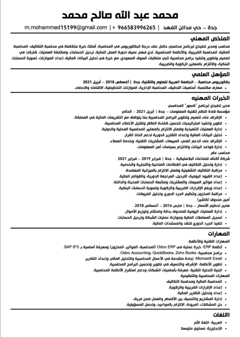 محاسب مالي بخبرة عملية في اعداد القيود اليومية وتنظيم شجرة الحسابات وإدارة الدورة المحاسبية بالكامل. لدي خبرة في العمل على أنظمة المحاسبة مثل SAP وOdoo، ومتابعة حسابات العملاء والموردين وإدارة المصروفات والايرادات بدقة. أجيد استخدام Excel في اعداد التقارير والتحليلات المالية، ولدي معرفة بضريبة القيمة المضافة واعداد الاقرارات الضريبية. أسعى للانضمام الى شركة محترفة أضيف لها قيمة حقيقية. متاح للعمل