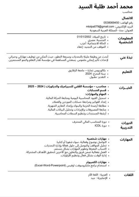محاسب عام خبرة أربع سنوات في الحسابات العامة والضرائب خبرة في التقفيلات الشهرية والسنوية التسويات الجردية ومذكرة تسوية البنك الاقرار الضريبي لضريبة القيمة المضافة العمل علي حسابات العملاء والموردين القوائم المالية وفقا لمعايير الدولية التعامل مع تطبيقات التسويق الالكتروني (سلة - ذا شيفز) التعامل مع منصات البنك اونلاين وتنفيذ الحوالات المحلية والدولية متواجد حاليا في الرياض