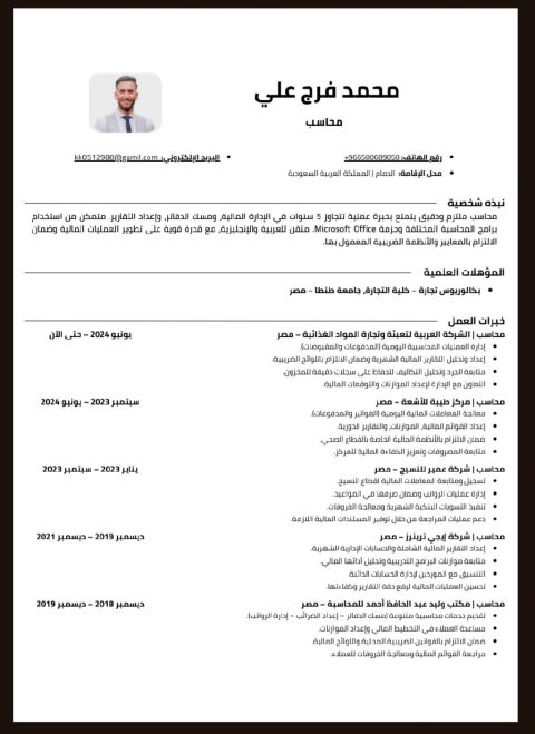محاسب عام مصري، خبرة 8 سنوات بالمملكة خبرة في اعداد قيود اليومية والمطابقات البنكية والتسويات الشهرية والسنوية ومتابعة ومطابقة حسابات العملاء والموردين واعداد التقارير الشهرية، مطابقة وتصفية العهد والمساعدة في اعداد القوائم المالية واعداد ورفع الاقرارات الضريبية واعداد مسيرات الرواتب ورفعها على مدد خبرة في برنامج Odoo ERP وأغلب برامج ERP SYSTEM إقامة سارية قابلة للنقل ورخصة قيادة سارية