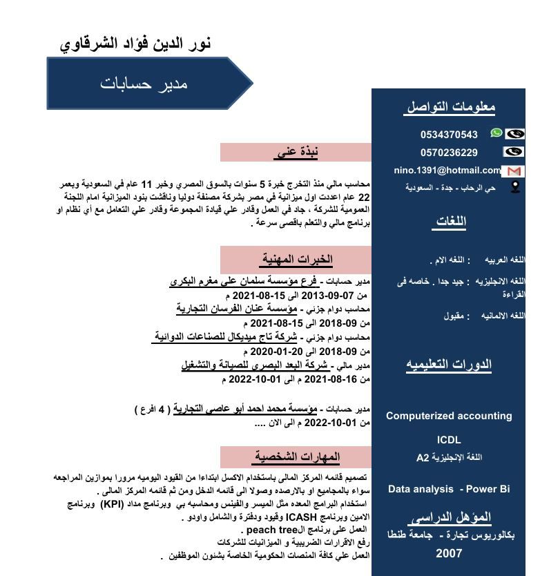 مدير حسابات ابحث عن وظيفة دوام جزئي فترة الصباح خبرة 12 عام في السوق السعودي (اعداد ميزانيات ورفعها للزكاة والدخل، اقرارات ضريبية، اعداد وانشاء الحسابات وتحليل البيانات باستخدام power bi) التعامل مع كافة المنصات الحكومية والخاصة بالموظفين (البرامج المحاسبية - أودو، الأمين، دفترة، قيود، الشامل، أي كاش، مداد) عنواني حي الرحاب جدة