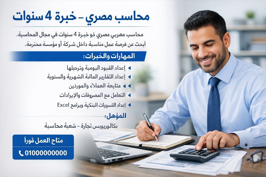 محاسب مصري - خبرة 4 سنوات محاسب مصري حاصل على خبرة عملية 4 سنوات في مجال المحاسبة، ابحث عن فرصة عمل مناسبة داخل شركة أو مؤسسة محترمة. المهارات والخبرات اعداد القيود اليومية وترحيلها اعداد التقارير المالية الشهرية والسنوية متابعة العملاء والموردين التعامل مع المصروفات والايرادات اعداد التسويات البنكية العمل على البرامج المحاسبية وMicrosoft Excel الالتزام والدقة وتحمل ضغط العمل