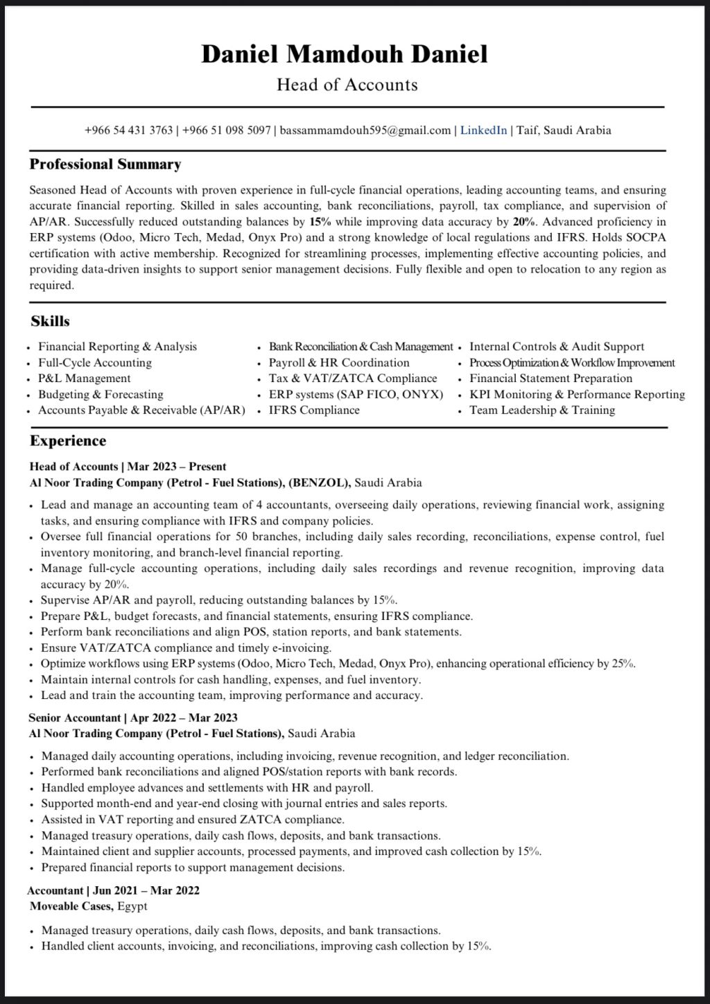 رئيس حسابات أو محاسب أول - في جدة - عضوية وشهادة SOCPA خبرة عملية مثبتة في المحاسبة، بما في ذلك، ومراجعة الحسابات والقيود، وإدارة الفريق، والتعاون مع المديرين والادارات المختلفة، واعداد ومراجعة ورفع التقارير الضريبية على موقع الهيئة، وإجراء عمليات استرداد الضرائب والتدقيق، واعداد التقارير والقوائم المالية للشركة، وعمل التحليل المالي، ومراقبة البنوك والمصروفات والعمل على تخفيضها، والتعامل مع مكاتب المراجعة