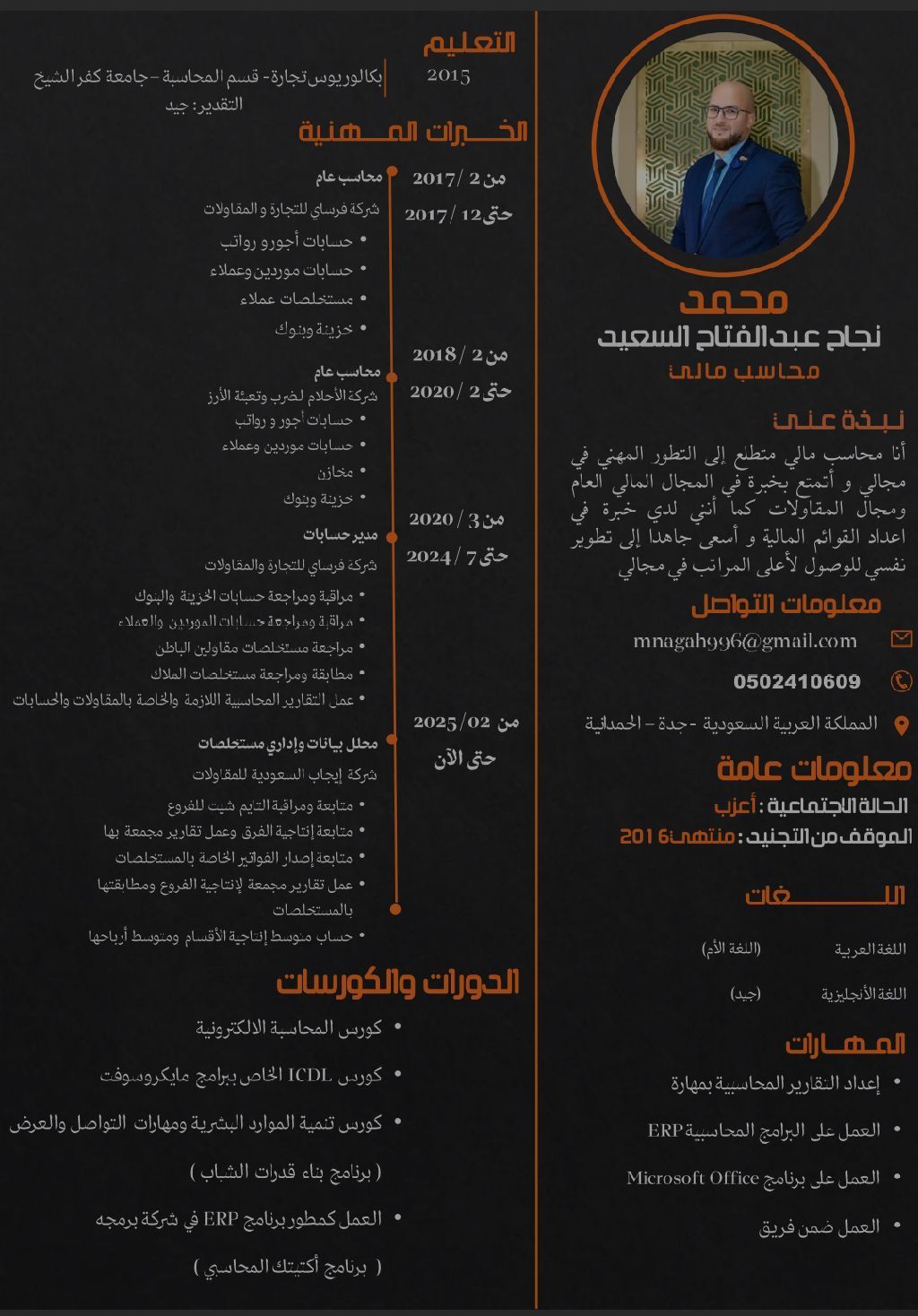 مصري الجنسية محاسب عام ومقاولات خبرة أكثر من 7 سنوات + خبرة في العمل على البرامج المحاسبية ERP + خبرة في اعداد التقارير وحسابات التكاليف الخاصة بالمقاولات