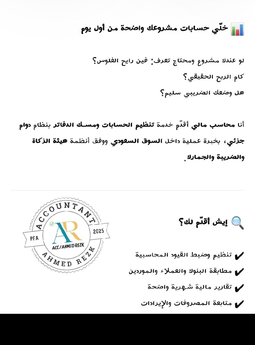 خدمات - محاسبية محاسب - للمشاريع إدارة - حسابات تنظيم - حسابات مسك - دفاتر - محاسبية استشارات - ضريبية ضريبة - السعودية رفع - اقرار - ضريبي التزام - مالي صاحب - مشروع تاجر مؤسسة شركة - ناشئة أودو - System قيود - محاسبي دفترة دوام - جزئي عمل - عن - بعد محاسب - عن - بعد السعودية
